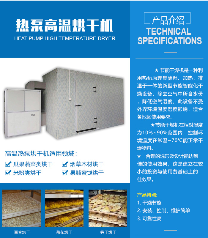 同恩牌熱泵干燥機(jī)是一種利用熱泵原理集除濕、加熱,排濕于一體的新型節(jié)能智能化干燥設(shè)備,來(lái)除去空氣中所含水份,降低空氣濕度,此設(shè)備不受外界環(huán)境溫度濕度影響,適合各地區(qū)使用要求。機(jī)器采用我公司回?zé)嵫h(huán)熱泵除濕方式,拓寬了除濕機(jī)在工業(yè)干燥領(lǐng)域的應(yīng)用,干燥性能比普通熱泵除濕干燥節(jié)能30%以上,大大節(jié)約運(yùn)行費(fèi)用;中高溫干燥方式(常溫~70℃),接近自然干燥,被干物品的品質(zhì)好、色澤好、產(chǎn)品等級(jí)高,無(wú)污染,而且***環(huán)保衛(wèi)生要求。干燥過(guò)程中物料不變形、不開(kāi)裂、不變色、不變質(zhì)、不氧化、干燥徹底、干燥后復(fù)水性好、營(yíng)養(yǎng)成分損失少,儲(chǔ)存期長(zhǎng),比任何傳統(tǒng)干燥設(shè)備更有效地保護(hù)干燥物的色、香、味、個(gè)體形態(tài)和有效成分。采用送風(fēng)循環(huán)脫水并實(shí)現(xiàn)物料快速干燥。機(jī)組采用觸摸屏全自動(dòng)控制方式(帶有溫濕度設(shè)定,機(jī)器故障顯示及工作模式和設(shè)定定時(shí)開(kāi)關(guān)機(jī)、循環(huán)開(kāi)關(guān)機(jī)以及時(shí)空模式等),性能穩(wěn)定,操作方便。根據(jù)客戶(hù)需要,可設(shè)定不同干燥曲線,滿(mǎn)足不同種類(lèi)物料干燥,具有適用范圍廣,干燥效果顯著,外形美觀,結(jié)構(gòu)緊湊,功能齊全,運(yùn)行寧?kù)o,機(jī)組獨(dú)立放置在庫(kù)房外,易維護(hù)及操作,延長(zhǎng)設(shè)備使用壽命。